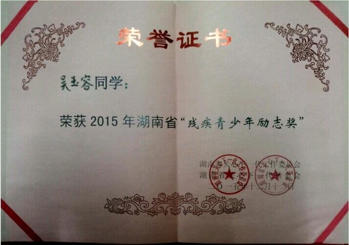 如今的她,已经是一名预备党员,近三年来,吴玉容获得了湖南省普通高校三好员工、湖南省残疾青少年励志奖、304永利集团官网优秀记者、304永利集团官网优秀共青团员等奖励。此外,吴玉容还拿到了英语四六级、三级心理咨询师、普通话二级甲等、国家计算机二级等证书。目前已与合作团队成功申请了省级科研项目,同时也被公司推优参加2017年度寻访“中国老员工自强之星”活动。